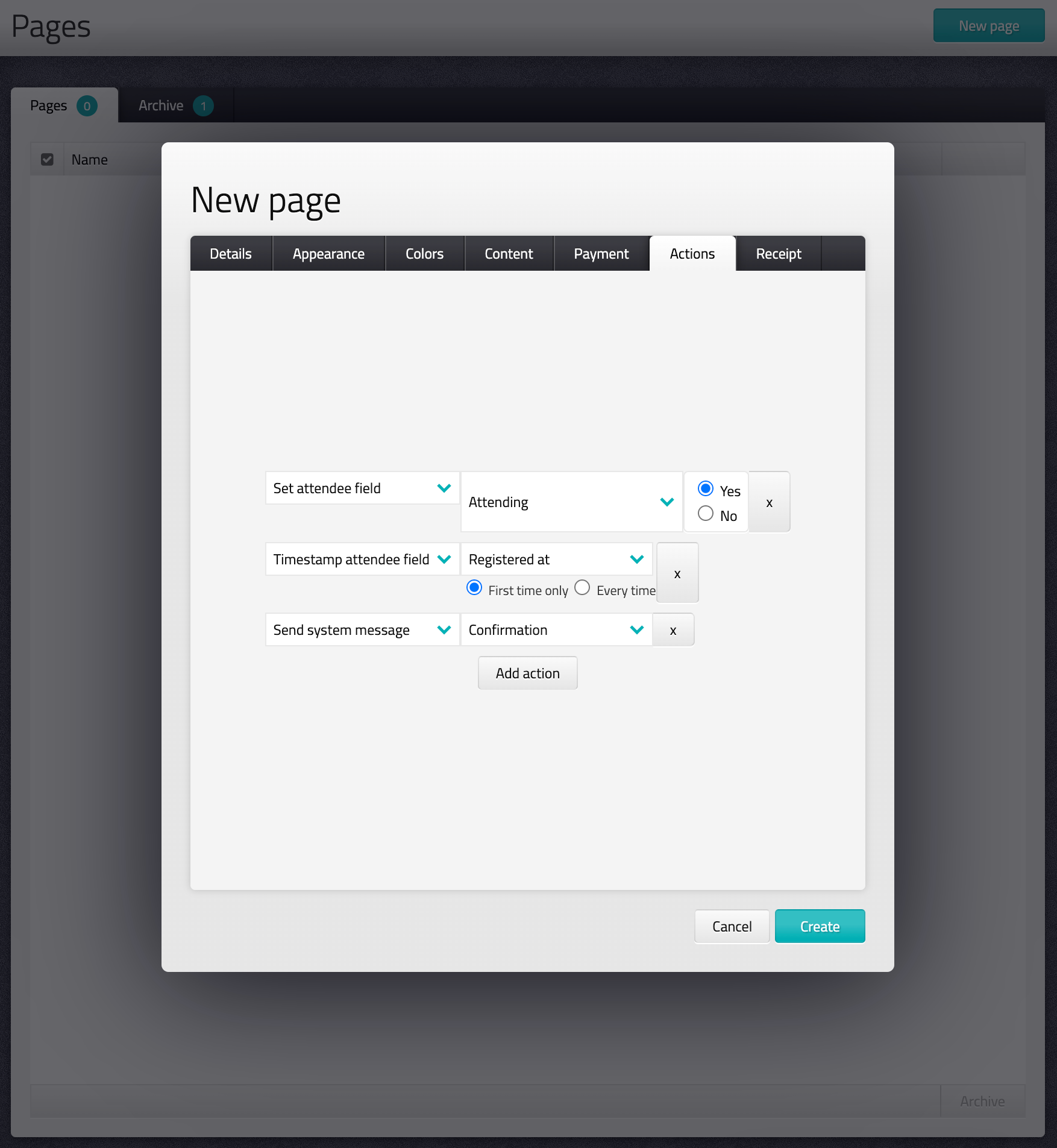 - Go to Actions, set actions that runs when an attendee signs up